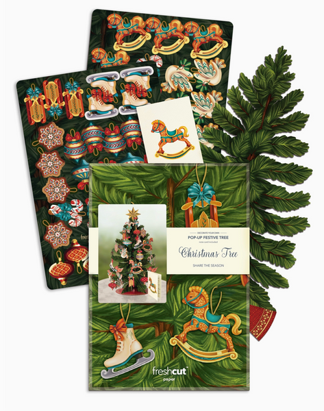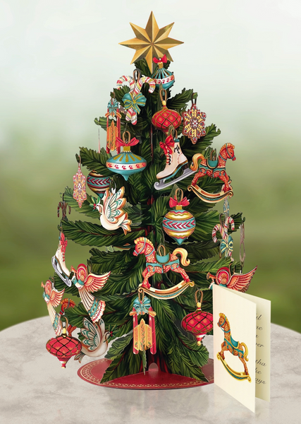 Christmas Tree includes classic shiny ornaments and a matching notecard - Foldable design and gift ready festive envelope.