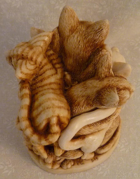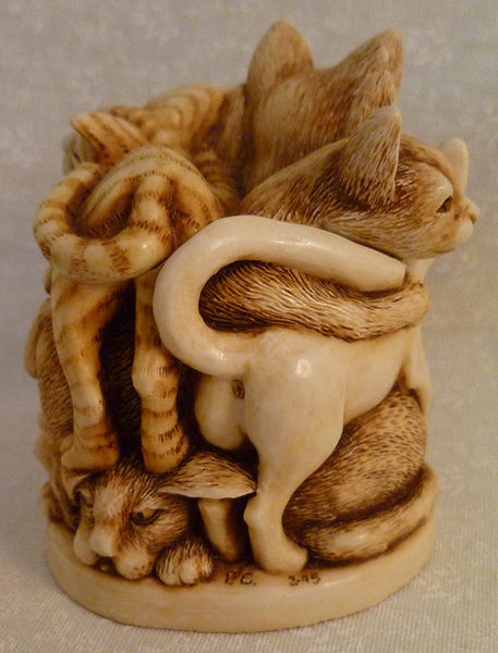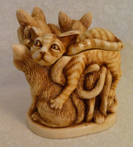 Secrets: In this box figurine the group of cats stare off into space, apparently unaware that a mouse is hiding right in middle of them. Markings include 'PC' and '2.95' (carving date), which is near the hind leg of the white cat but may not have been reproduced due to the wearing of moulds. Interior hallmarks include © and HBC logo.