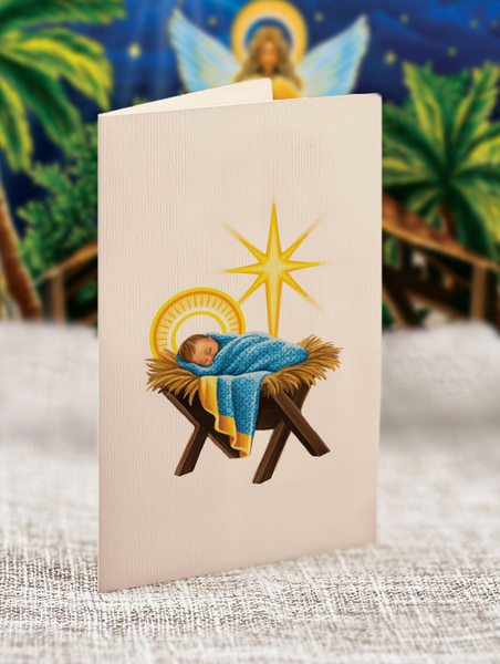 The reason for the season comes to life in this mini pop-up nativity scene with gold foil detailing. The traditional cast of the beloved nativity gathers under lush olive trees, palms, and a Christmas star.