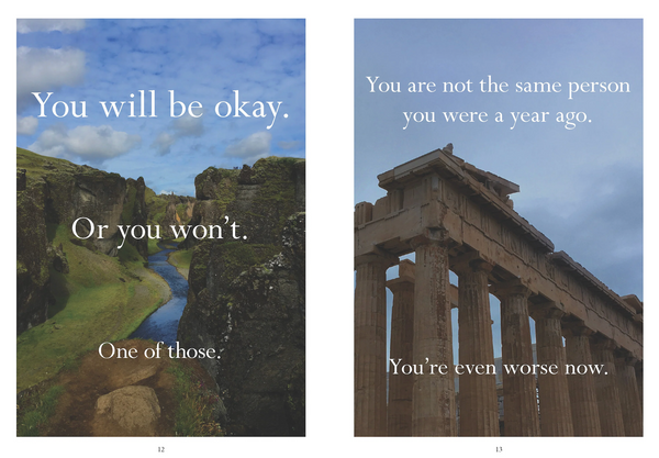 Inside you’ll find sharp, self-aware affirmations paired with Tarnowski’s moody photography and new essays that dig a little deeper into life’s everyday absurdities, from work and relationships to “success” (whatever that means) and the general hellscape of interacting with other humans.