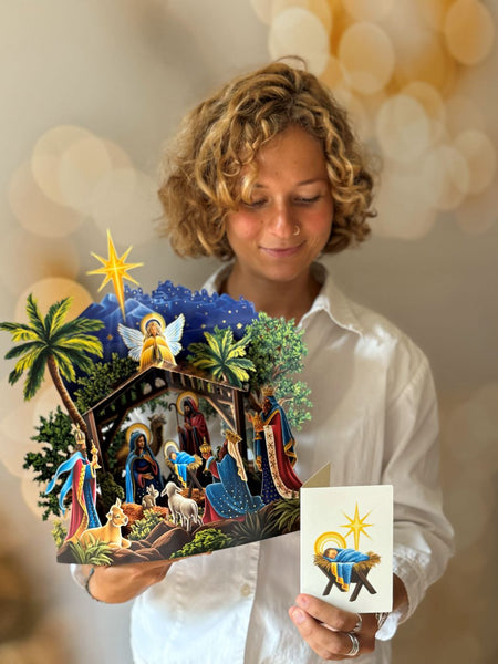 The reason for the season comes to life in this pop-up nativity scene with gold foil detailing. The traditional cast of the beloved nativity gathers under lush olive trees, palms, and a Christmas star.